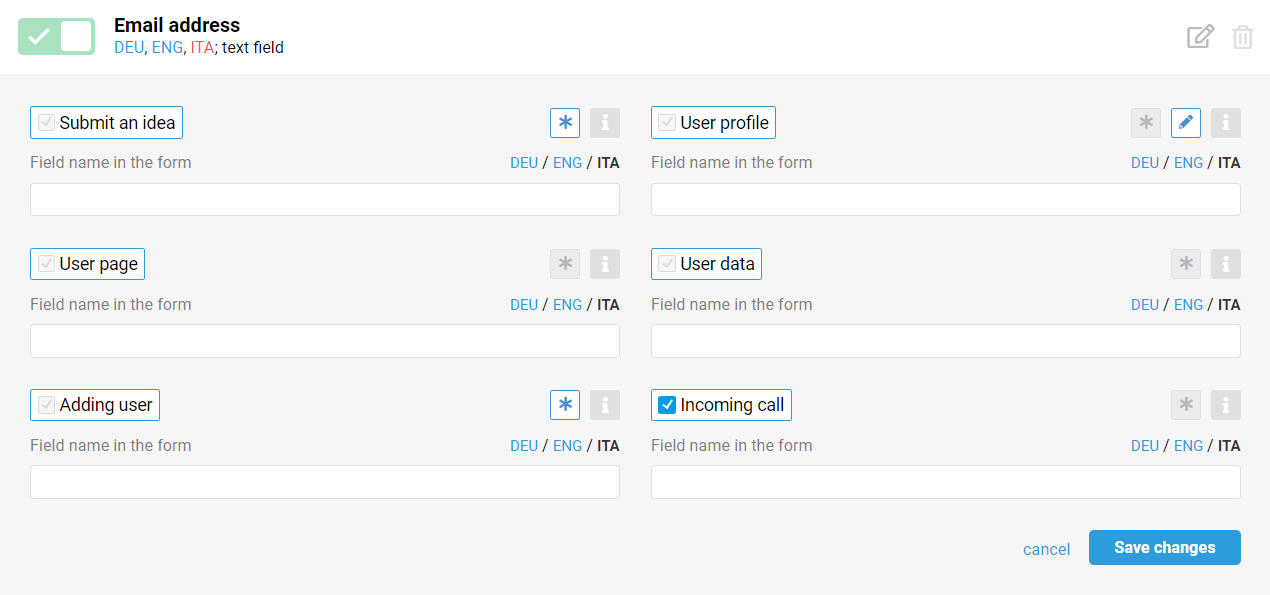 Each standard field displays by default all the forms it can be added to. In most cases, the desired forms are already active and cannot be disabled. In this case, it is possible to change the name of the field in any of the forms. Sometimes you can also specify if the field is required.
