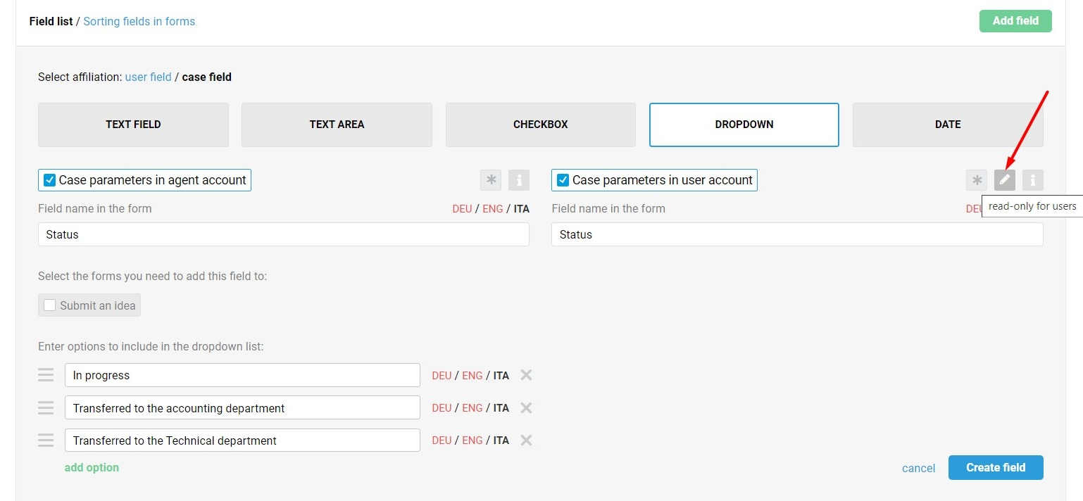 First of all, we indicate that this is a case field since the data is not related to the user. Next, select the "Dropdown" type to provide the user with the opportunity to select the appropriate one from the options we have specified. We activate the forms "Case parameters in agent account" and "Case parameters in user account". To add this field to the widget, you need to add it in the settings of the widget itself.