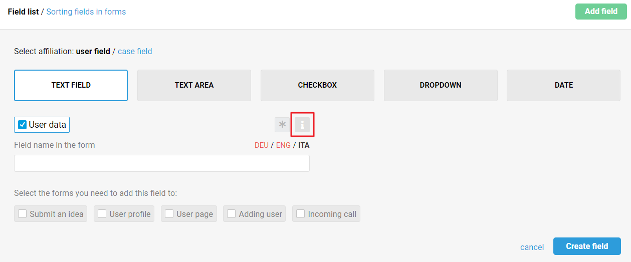 When creating an additional field, you need to choose: affiliation, type, and forms in which it will be added.