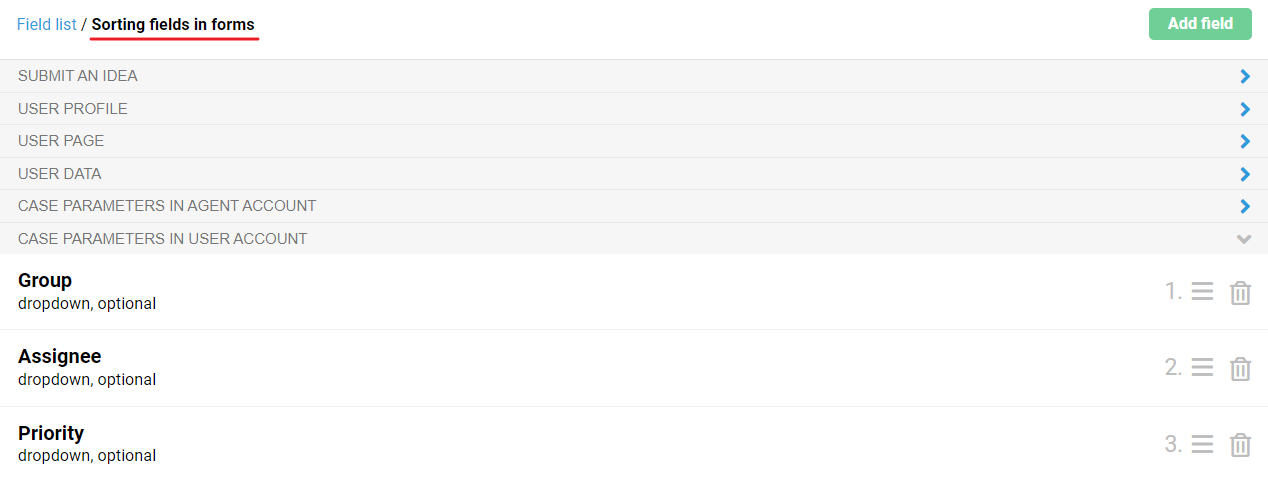 You can also change the order of the fields in the forms. To do this, go to the "Sorting fields in forms" tab, find the desired form and arrange the fields in the desired order.